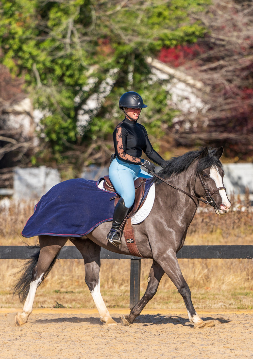 We’ve designed the London Grip Breeches for the best comfort when you ride! These breeches are a mixture between riding leggings and breeches. It has a grip knee patch with four-way stretch and high-rise for the most flattering fit. The mesh lower leg panels are soft and breathable. These breeches feel like a custom fit for all and are fit true to size. They feel great while looking luxurious with belt loops 1.5 inches and front pockets.